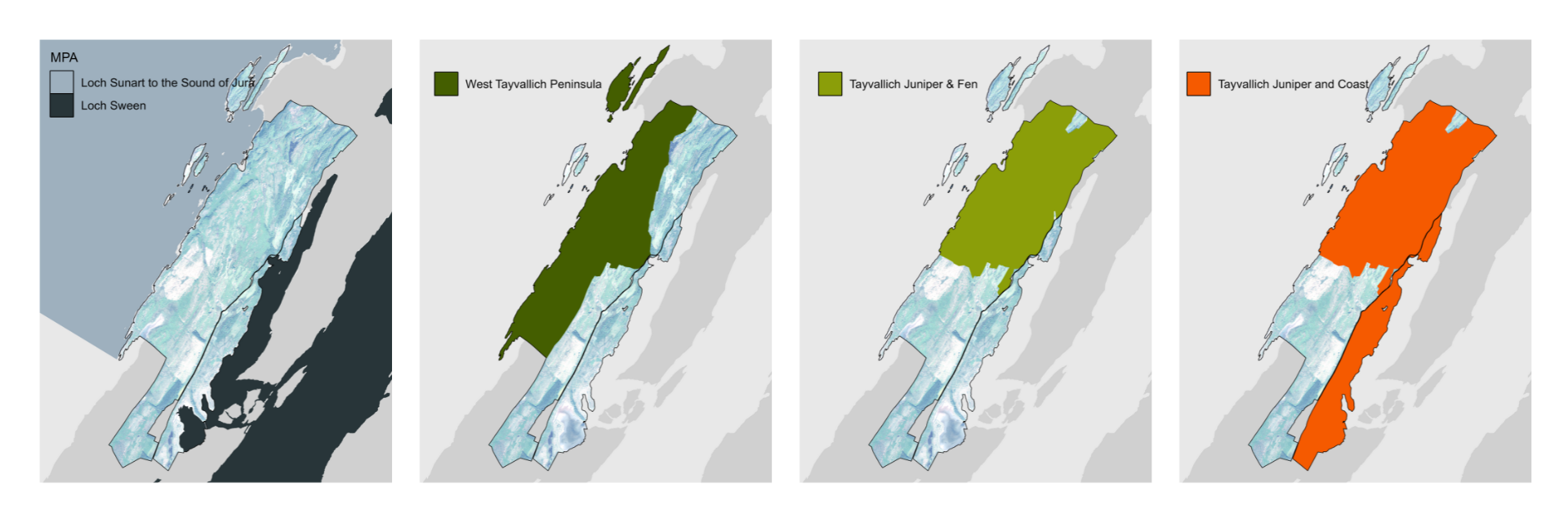 Barrahormid designations, above, left to right: Loch Sween MPA and Loch Sunart MPA, West Tayvallich Peninsula SSSI, Tayvallich Juniper and Fen SSSI, Tayvallich Juniper and Coast SAC.